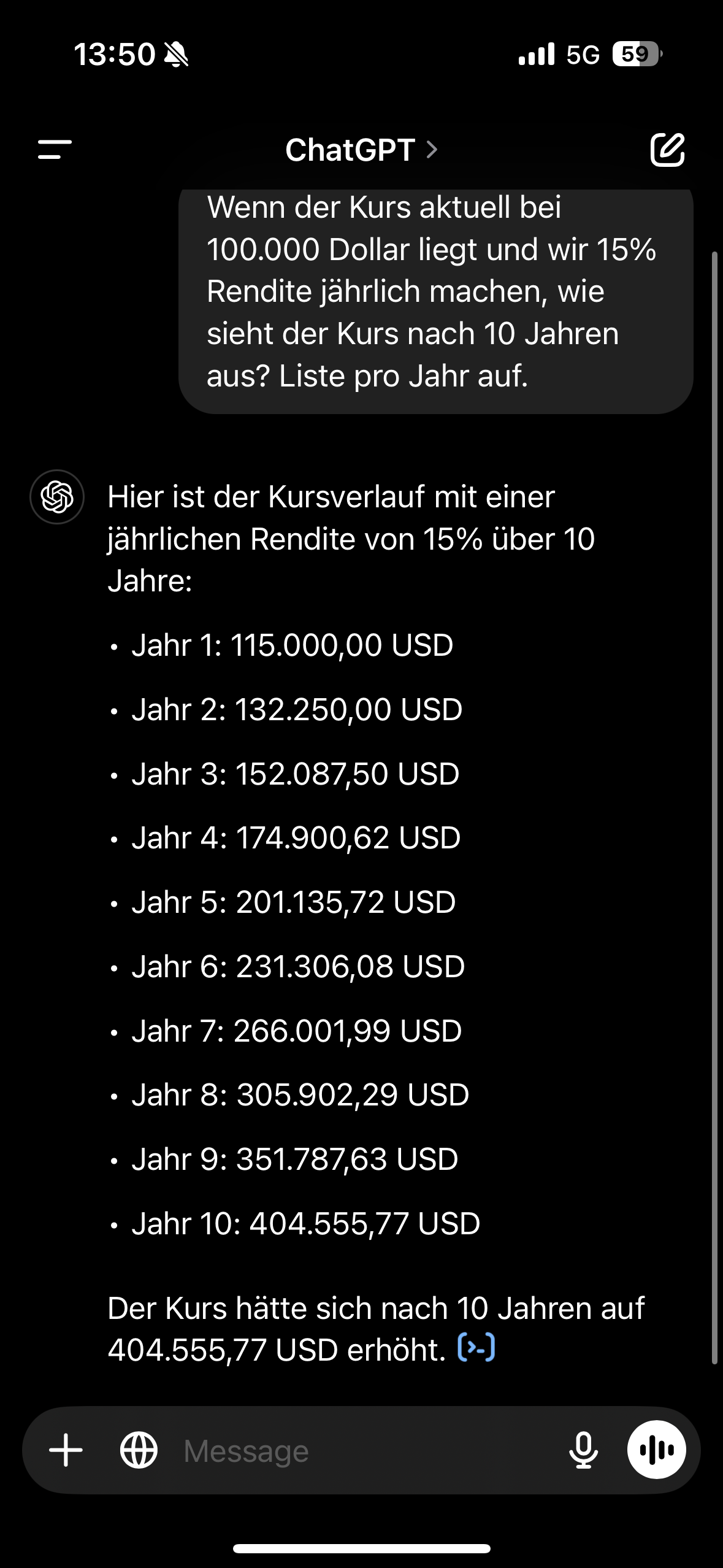 ! Vorausgesetzt, dass du die Rate sicher zurückzahlen kannst ist das der beste Deal deines Lebens. Ich gehe zu 99,9% davon aus, dass der Bitcoin in diesen 10 Jahren 7-stellig wird. Es geht mathematisch gar nicht anders