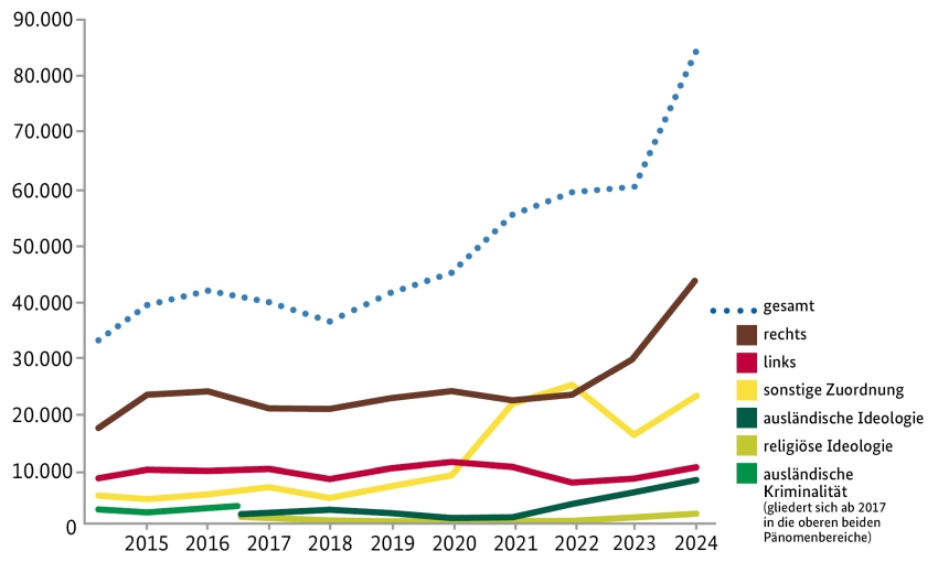 Naja, die Anzahl an Straftaten ist seit Jahren in der rechten Ecke höher. Der Ansteig der letzten Jahre ist auf viele Propagandadelikte zurückzuführen. Aber im letzten Jahrzehnt war die Anzahl der Straftaten von rechts größer (und häufig gewaltsamer):