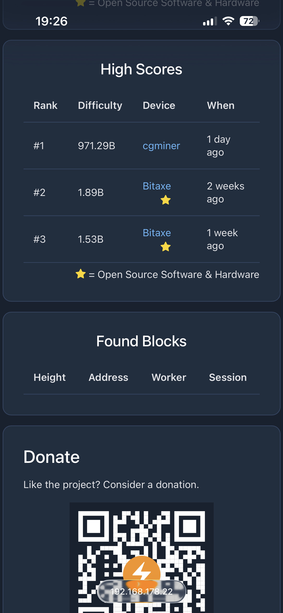 Wobei ich zugeben muss, ich hab zwar zwei von 3 Bitaxe die ein bisschen an 1,89 G gekommen sind, das sind zwei Kollegen von mir die mit auf meinem Pool sind, nur performen der Hydro und die Avalon Geräte besser bei mir, Bitaxe ist ein Langstrecken Läufer, vielleicht überrascht mich der ja noch weiter.