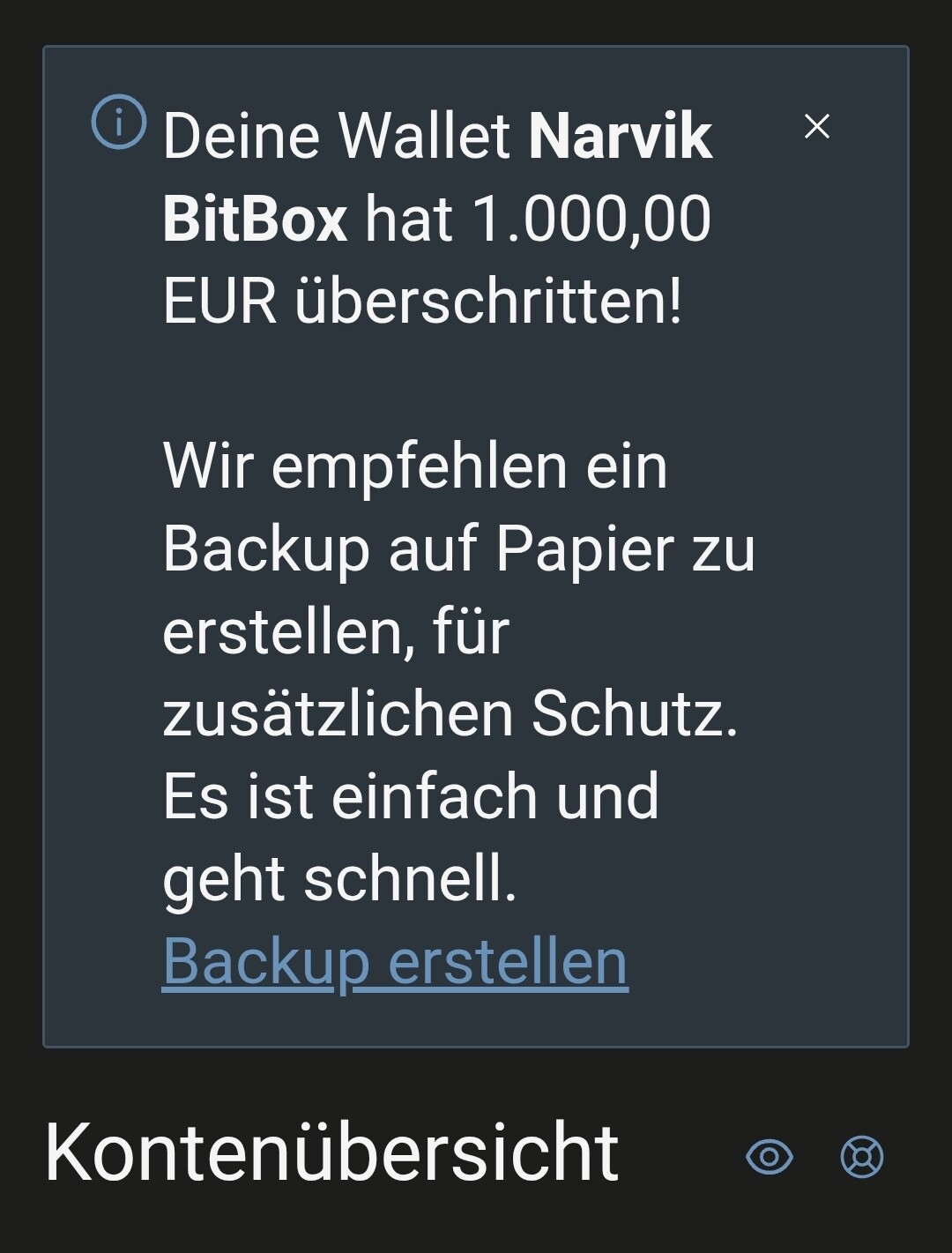 Das wurde mit einem der letzten Updates eingeführt. Es ist einfach nur ein Reminder für ein Backup bei einem Portfolio, das den Schwellenwert von 1.000 € überschritten hat👍