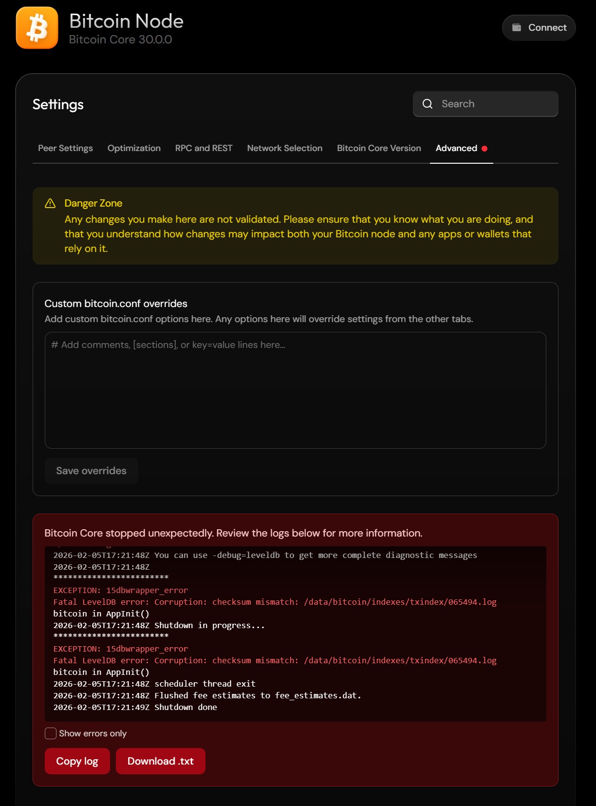 Die Bitcoin-Node ist gestoppt, weil eine interne Datenbank (LevelDB) beschädigt ist – konkret der Transaktionsindex (txindex).