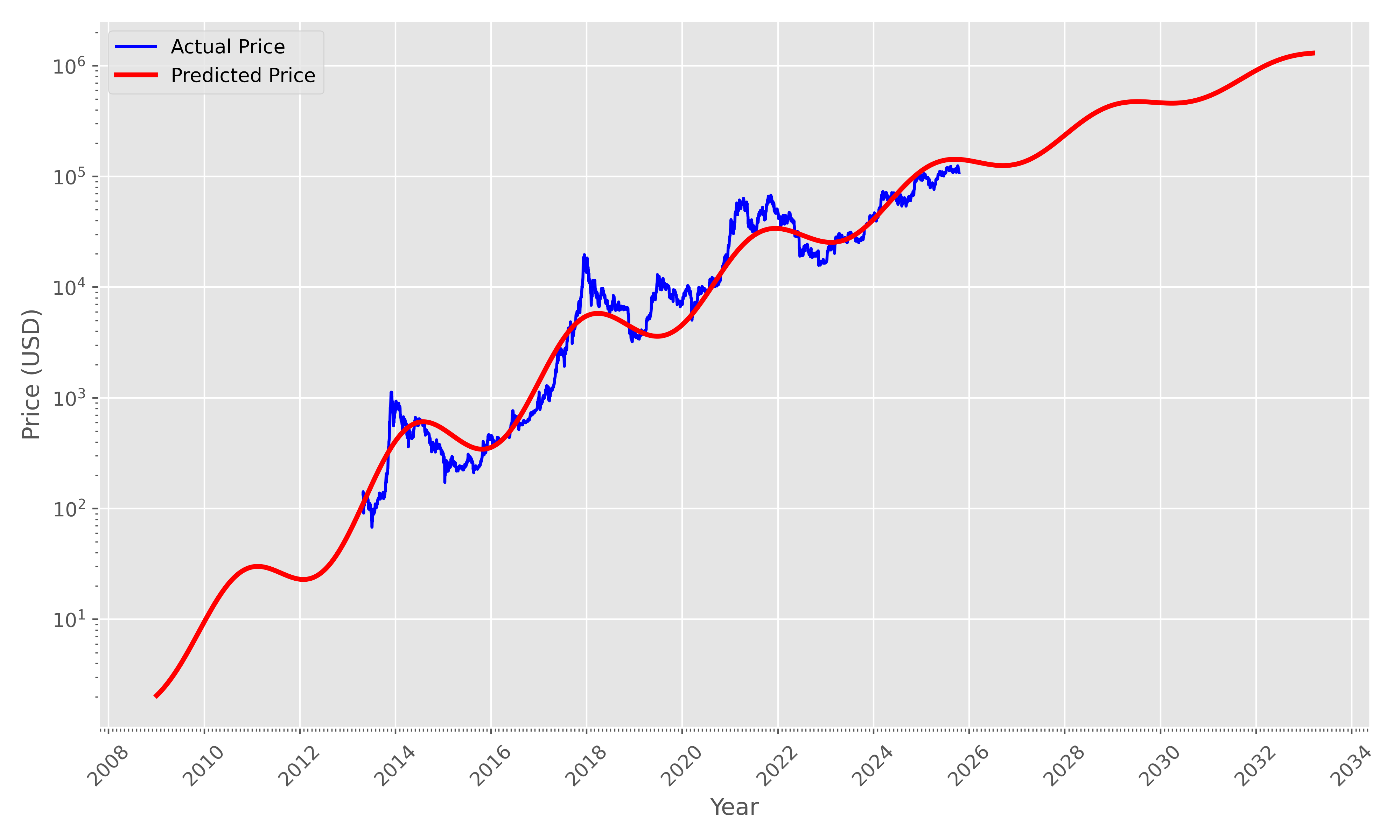 Fiat ist ein moving target (Inflation), sodass dies kein konstanter Denominator sein kann. Damit muss man in jedem Modell, was einen Fiat-Preis vorraussagt die exponenzielle (!) Inflation mit berücksichtigen. Auch der technologische Fortschritt ist ein moving target, dessen Wachstum expenziell modelliert werden kann (!). Beides Zusammen bestimmt die Entwicklung der Kaufkraft, die der denominator ist, wie o.g. geschätzt aus historischen Daten auf 5.8% p.a.