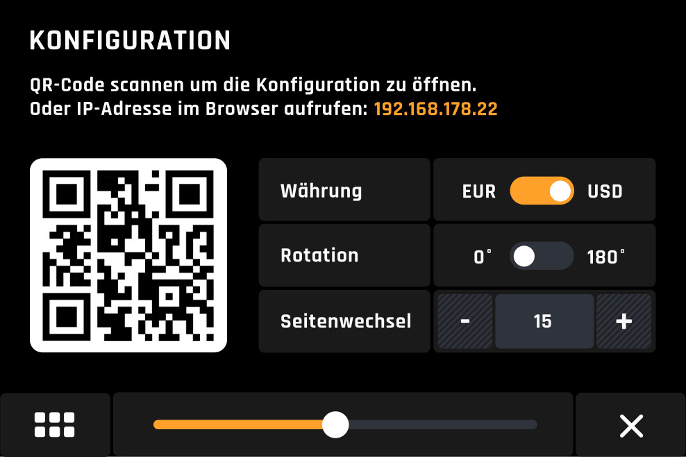 Ich würde es noch cool finden wenn nicht nur ein allgemeiner Intervall des Wechsels einstellbar wäre, sondern auch wie lange die jeweiligen einzelnen Seiten generell eingeblendet werden sollen, mit größeren Intervallen als 60 sek beim Wechsel und auch beim aktualisieren des Preises.