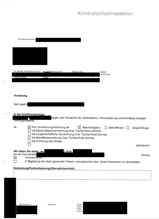 Man beachte, dass der Verdächtige nur über die Art des Verdachts informiert wird, aber nicht über den Kontext (wie z.B. durch Einzahlung am 20.02.2024 von BTC bei ihrem Account XYZ der Kryptobörse BSDEX). Eine konstruierte sehr asymmetrische Informationslage, die das Überraschungs- und Druckmoment eindeutig auf Seiten des Staates stellt.