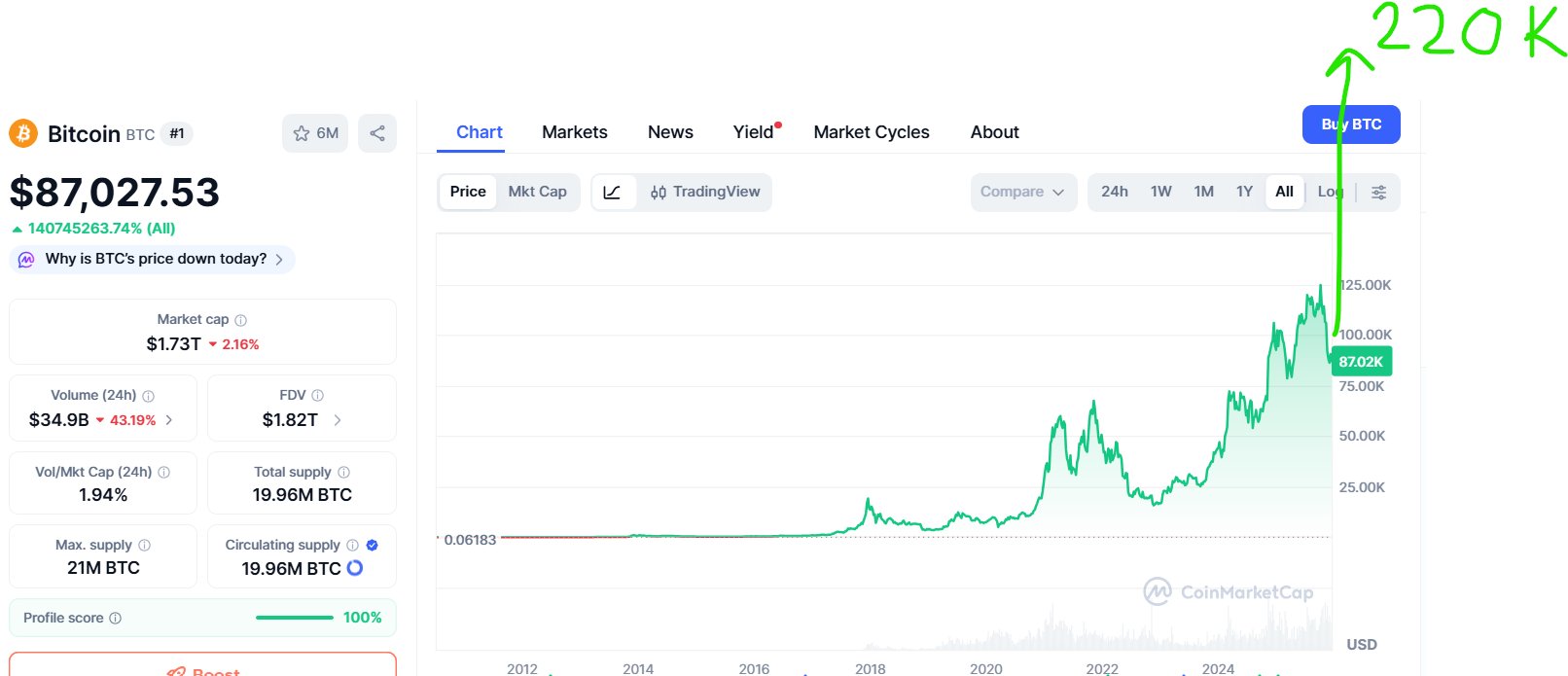 Möglich ist alles aber ich gehe nicht davon aus, dass wir in den nächsten 100 Jahren massiv unter das ATH vom letzten Zyklus fallen, welches im November 2021 bei rund 69.000 US-Dollar war. Also unter 60.000 US-Dollar ist sehr unwahrscheinlich