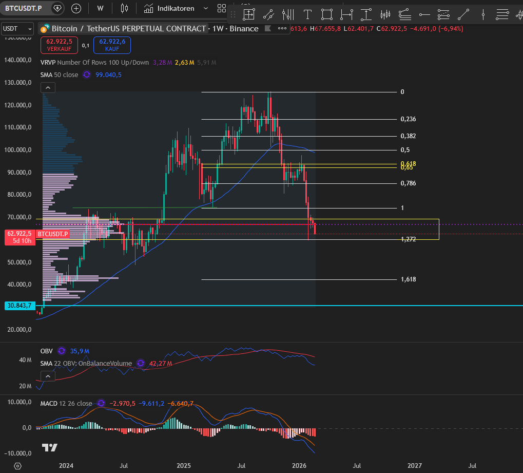 Das Problem ist m.M nach, dass unterhalb von 60k kein wirklich relevantes Volumen bis ca. 42k da ist. Bei 30k kommt dann sogar wieder sehr viel Volumen was man auf dem Chart hier nur gerade nicht sieht. Da wo kein Volumen ist, rasselt der Chart in den meisten fällen einfach durch, bis er wieder auf relevante Niveaus trifft. Kurze Erholungsrally ist aber schon möglich.