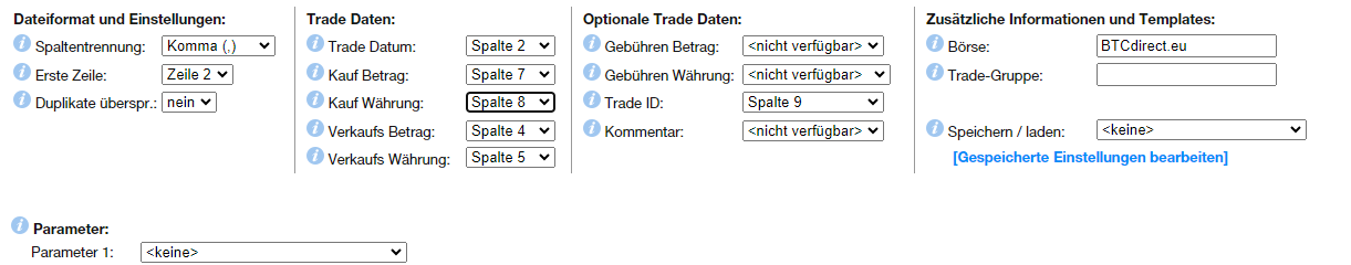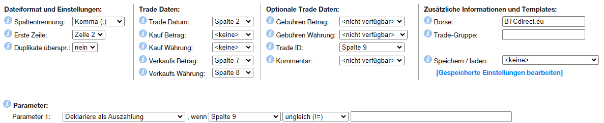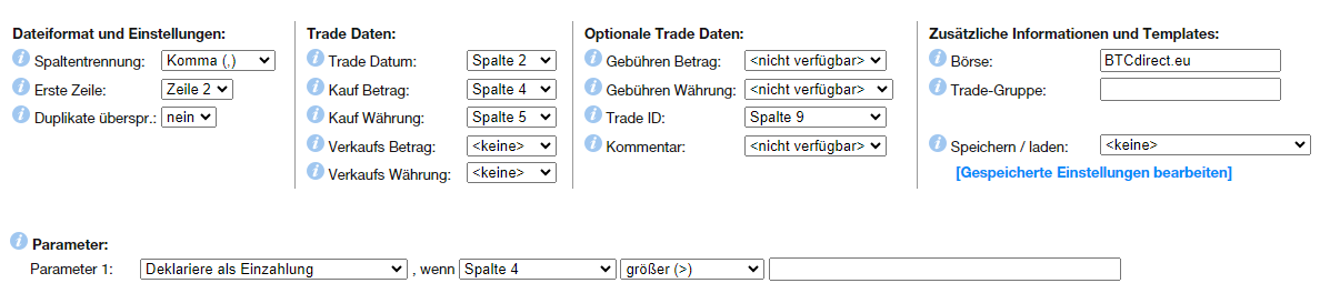 Schritt 2) Trades EUR gegen BTC importieren in Walletbezeichnung „BTCdirect.eu“