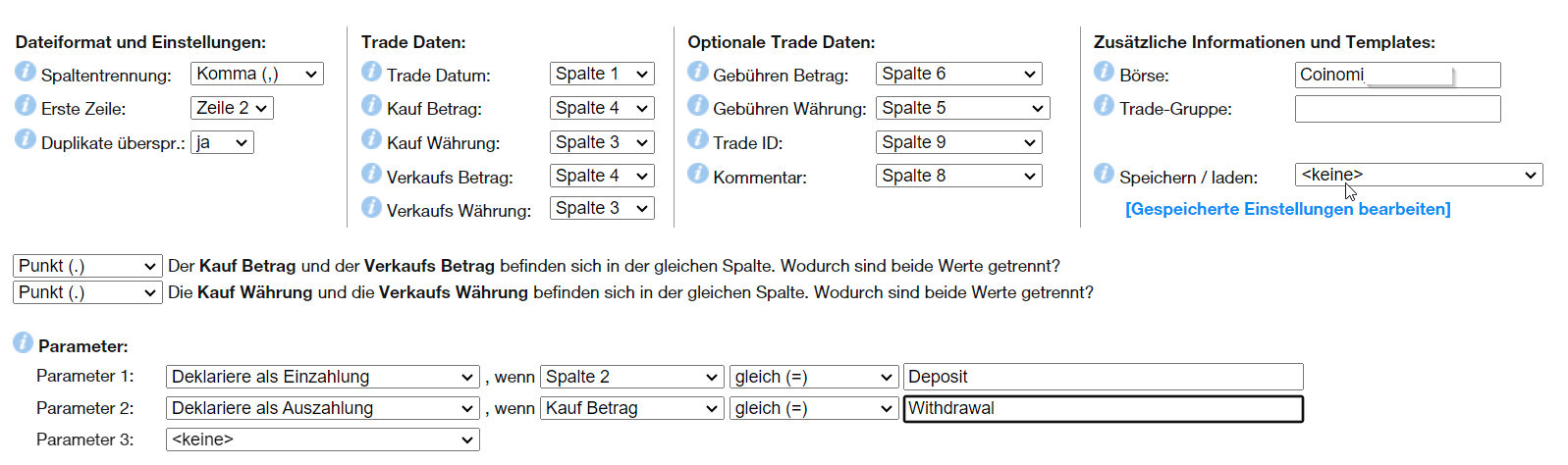 Exportier dir die CSV von deinem Account. Wir importieren nacheinander 3x die gleiche CSV mittels „Benutzerdefinierter Börsen Import“ (unter Coins eintragen → Multi Imports), lesen aber jeweils andere Informationen mittels Import-Skripten aus.
