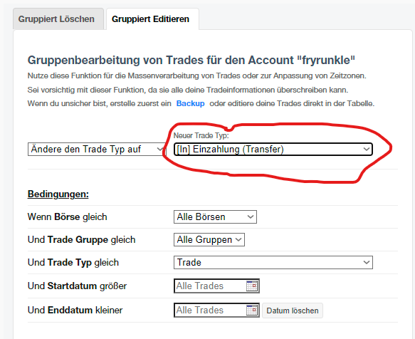 Letzte Frage wäre: Bei mir werden alle Trades auf der Börse als „trade“ angezeigt… in Wirklichkeit sind es steuerfreie swaps… jetzt wollte ich alle trades gruppieren und in swaps umändern… neuer Trade Typ swap gibt es nicht? Muss ich die einzeln / manuell umändern?