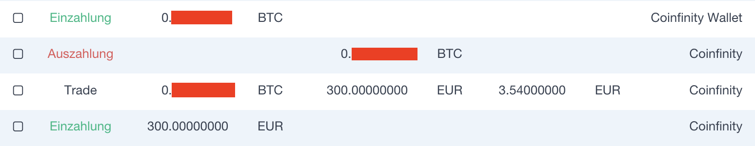 Wenn ich jetzt nur die .csv von Coinfinity importiere enstehen die drei Transaktionen “Einzahlung”, “Trade” und “Auszahlung”: