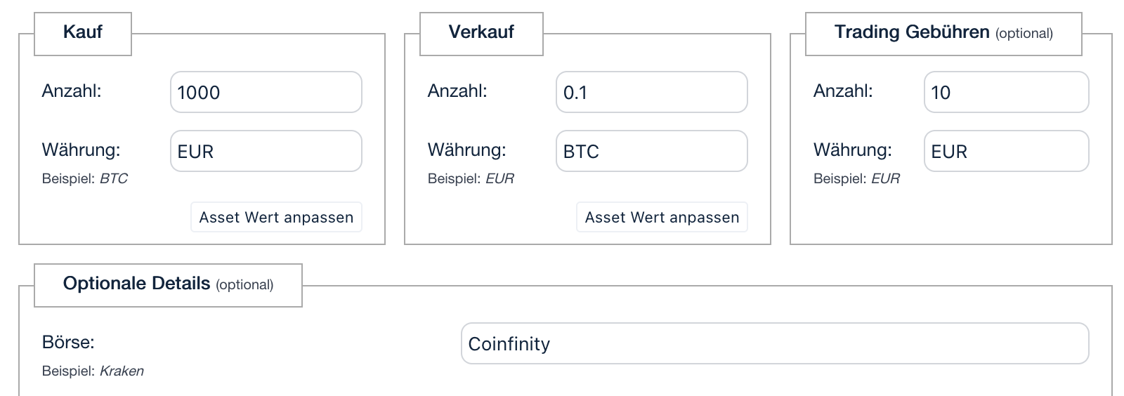 Wenn ich hier den Trade eintrage verkaufe ich z.B. 0,1 BTC für 1000€ mit 10€ Gebühr an Coinfinity.