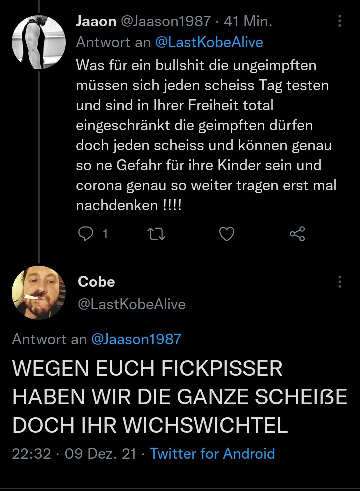 Übrigens geht es nicht um impfen ja nein. Das ist nur was für doofe. Und als einer Gruppe zugehörig die andere zu verschreien und sonstiges ist einfach nur dämlich. Siehst du nicht, daß dieses Gespalte das wirklich schlimme ist? Und dieses intolerante und moralische Getue als wären ungeimpfte die schlimmste, verkommenen unmenschen, und an der Scheiss Pandemie schuld. Kannst du denn noch in den Spiegel schauen?