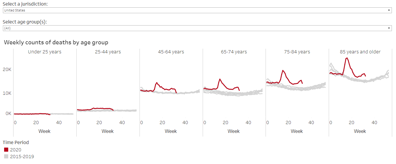 Klicke unten auf den RadioButton „Weekly Number of Deaths by Age“ und dann auf „Update Dashboard“