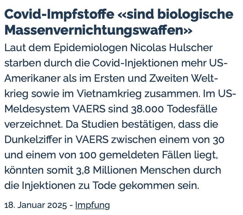 Es sollte selbst hardcore Impfgegnern klar sein, dass diese Zahlen nicht korrekt sein können. Als Referenz wird im Artikel ein Video-Interview von Hulscher zitiert - wenn der das sagt, muss es ja stimmen. Dazu sei angemerkt, dass eine publizierte Arbeit von ihm zu den angeblichen Impftoten wegen schwerwiegender Mängel vom Journal zurückgezogen wurde und ein hochgeladener Preprint zu dem Thema von Lancet am nächsten Tag entfernt wurde. Ich erspare mir hier Details zu den Kritikpunkten, die allesamt valide sind.