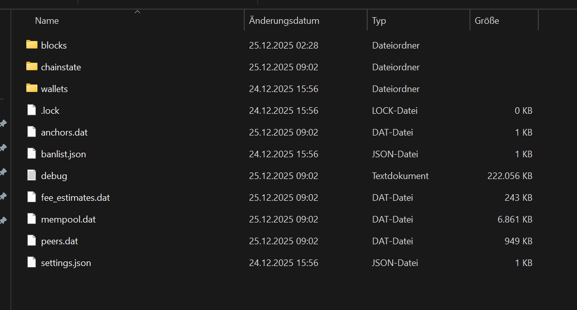 Falls noch nicht geschehen, die Node kurz anlaufen lassen und Bitcoin installieren, damit die Ordner da sind.