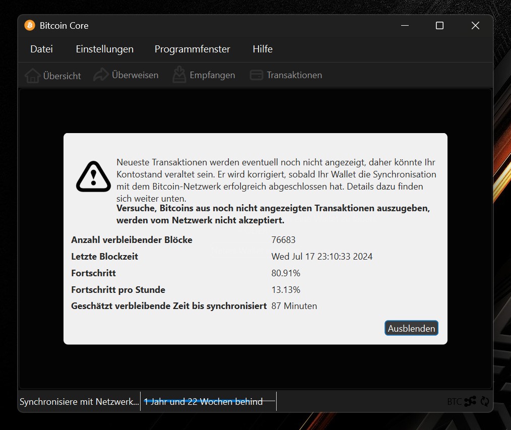 Ab 72%, ungefähr ab der Blockhöhe an der Taproot eingeführt wurde, ging es dann wirklich nur noch sehr langsam (unter 1% Fortschritt pro Tag). Manchmal zeigte es mir am nächsten Tag sogar 1% weniger an, als am Vortag. Lief also richtig gut…