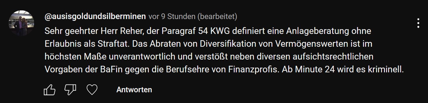 Das ist das Video mit den Aussagen des Blocktrainers, auf das ich mich beziehe: „NEWS zur BITCOIN-Reserve! ! MicroStrategy im Nasdaq 100! ! “: https://www.youtube.com/live/InDlsDWx60g | Der Paragraf 54 KWG definiert eine Anlageberatung und die Vermittlung von Finanzprodukten ohne Erlaubnis als Straftat. Ab Minute 24 wird es kriminell.