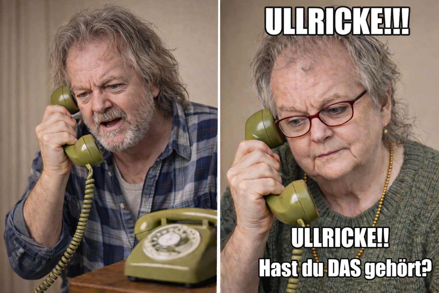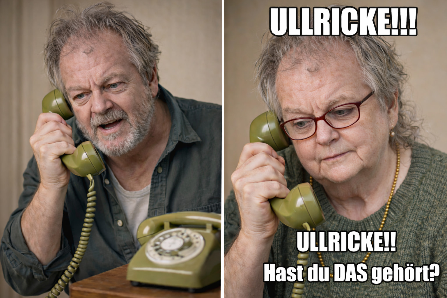 Danach noch ein Meme mit beiden am Telefon, z.B. mit “ULLRICKE!!! Hast du DAS gehört???!!!”