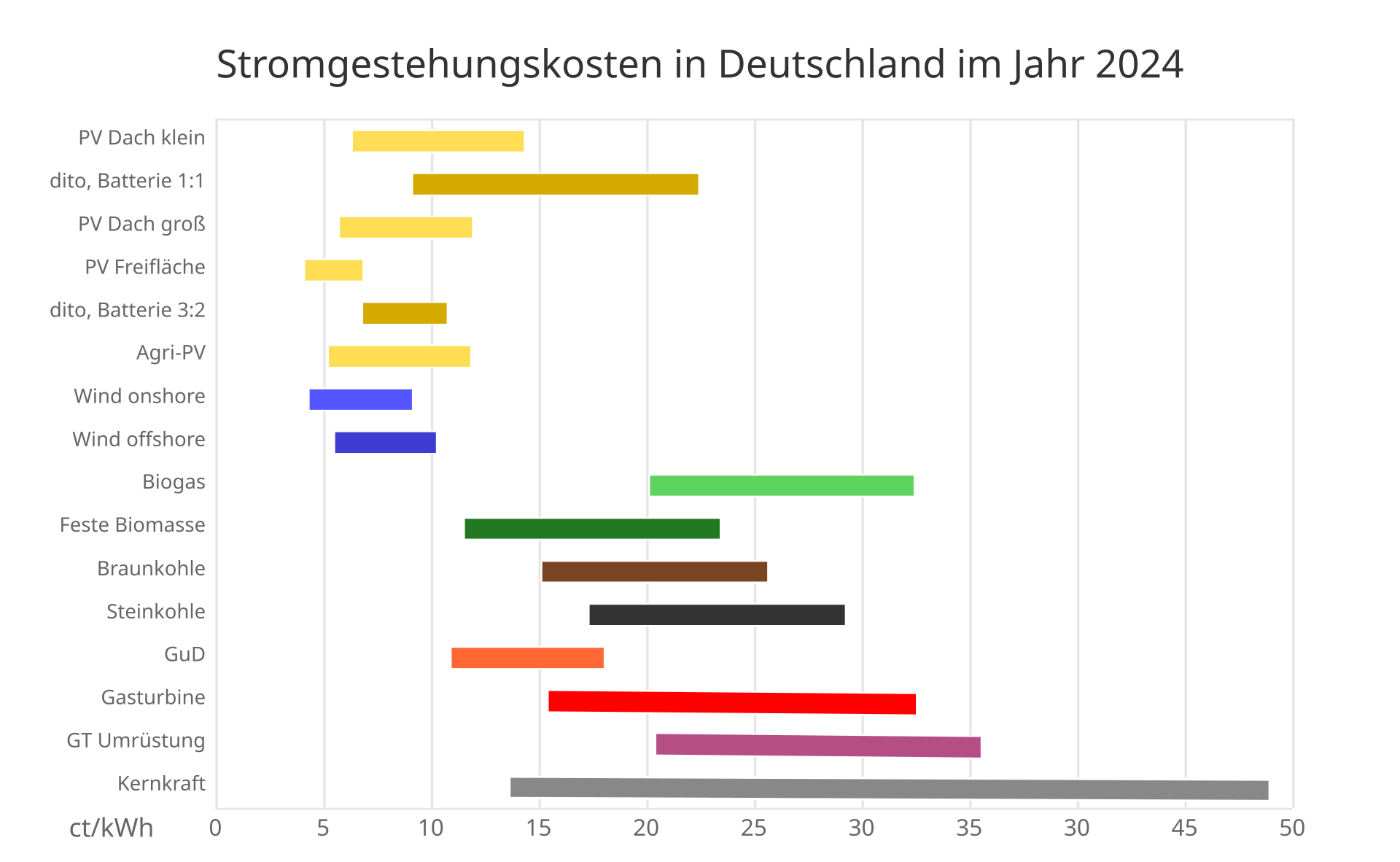 Für Deutschland lassen sich solche Einordnungen finden. Was allerdings nicht berücksichtigt wird, ist, dass die Erneuerbaren Energien nicht durchgehend Energie liefern. Die Kosten für die Anpassung des Angebots mit dem Bedarf wird in dieser Auswertung nicht berücksichtigt.