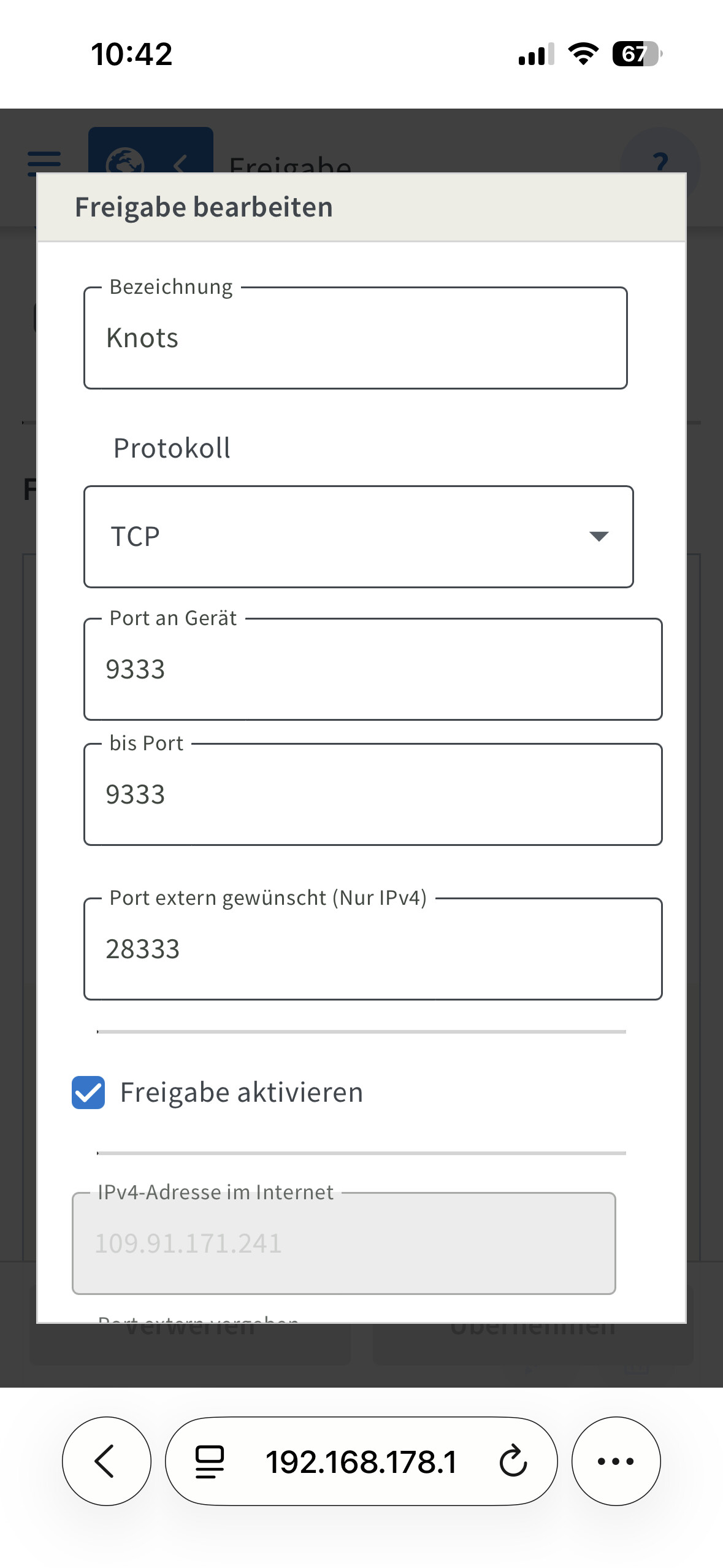 So ist die Fritz Einstellung bei mir, Umbrel nutzt intern den Port. Aber im Grunde müsste die Blockchain auch ohne portofreigabe geladen werden, diese Freigabe ist wichtig wenn du inbound haben willst, die kommt aber erst nachdem deine chain geladen ist. Was hilfreich ist den Cache hoch zu setzen.