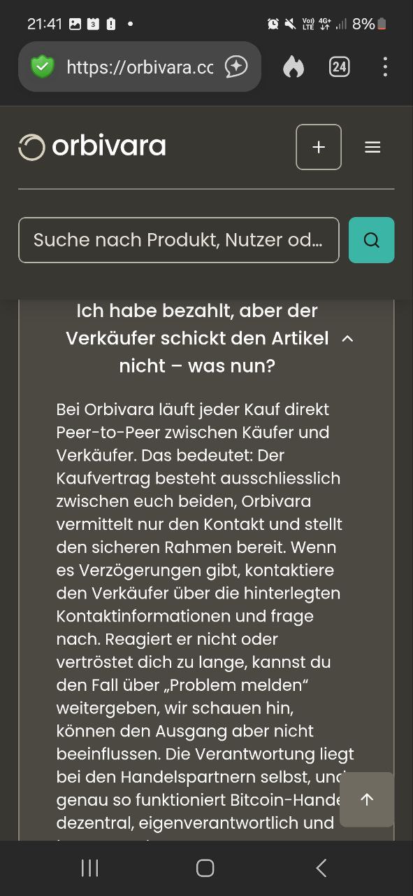 Es gibt zwar KYC, aber wer gescammed wird, hat trotzdem Pech, denn im Kleingedruckten steht, dass Orbivara auch nicht schlichten kann und man sich im Grunde selbst einig werden muss. Wirkliche Sicherheit hat man nicht…