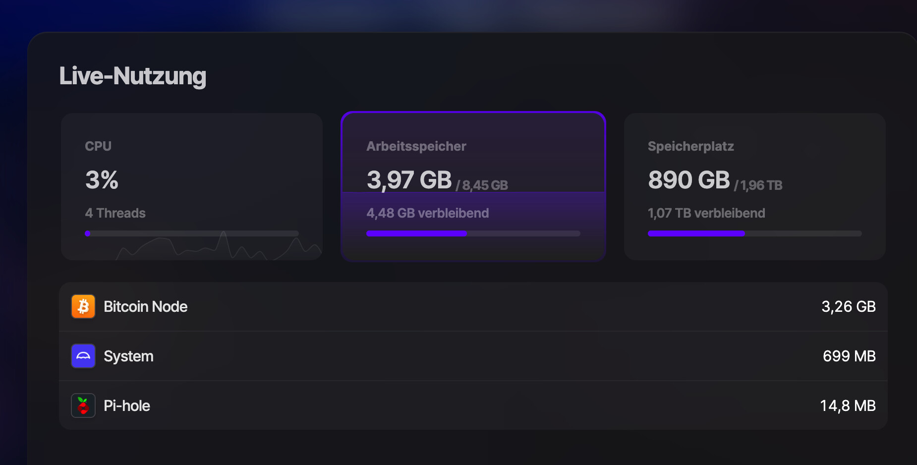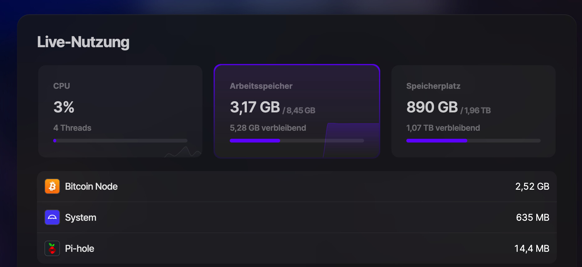 Das sieht ja noch human aus. Was genau verbraucht Bitcoin Node (kannst du auf das Widget klicken und dann Tab “Memory“)? Hast du einen Mini-PC? Auf meinem Raspi4 mit 8GB erlaubt sich die App mindestens 6 GB.