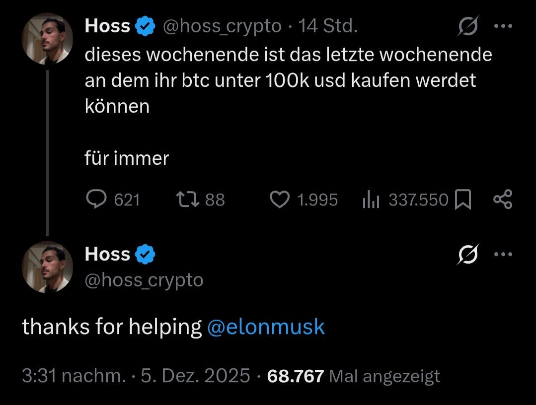 Ich sehe einige Punkte in deinem Beitrag und verstehe auch, was du meinst, aber ich sehe es nicht ganz so. Natürlich verweisen Influencer aufeinander, das gehört in diesem Umfeld einfach dazu. Trotzdem finde ich es in diesem Fall bemerkenswert, dass Kian sich so klar zu Bitcoin bekennt und offen sagt, dass Roman Reher von Anfang an recht hatte. Er hätte problemlos weiter den Weg gehen können, der ihm die meiste Aufmerksamkeit bringt, also Hebeltrading und bunte Altcoin Geschichten. Stattdessen stellt er sich hin und sagt ganz offen, dass er es falsch gemacht hat. Das macht man nicht nur wegen Content. Das macht man, wenn man wirklich verstanden hat, dass die Richtung nicht stimmte.