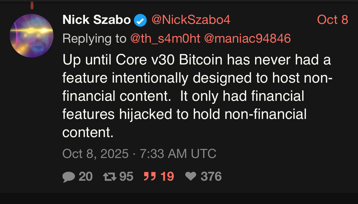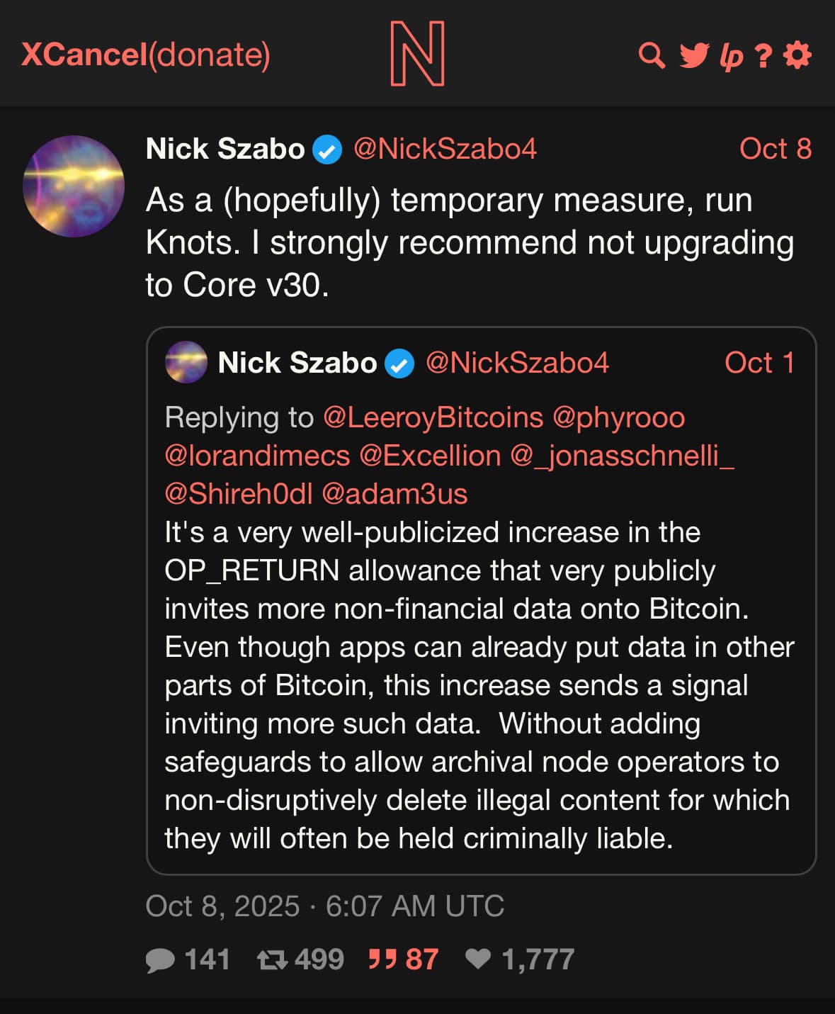 Nick Szabo ist nicht nur „Bitcoin Super-OG“ sondern auch Informatiker, Kryptograph und Rechtsgelehrter. Er war lange still und hat sich kürzlich nun in die Diskussion eingebracht, weil die Core-Devs versagen.