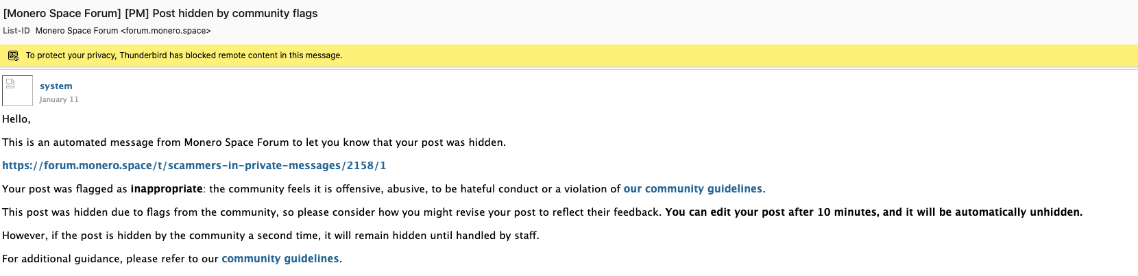 Diese E-Mail ist eine ganz normale Mitteilung von Discourse (der Foren-Software, die wir hier auch nutzen), wenn ein Post gemeldet und versteckt wurde. Theoretisch könntest du so etwas Ähnliches auch vom Blocktrainer Forum bekommen, nur dann auf Deutsch. ![]()