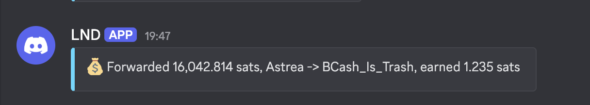 Deswegen kam mir folgende Idee: „Notifications wären hier doch schön.“ Bei meiner Recherche bin ich auf die Benachrichtigungsfunktion von Balance of Satoshis gestoßen. Die gesamte Funktion ist jedoch sehr beschränkt: Beispielsweise werden nur Telegram-Benachrichtigungen unterstützt und ich wollte die zusätzlichen Bot-Funktionen nicht.