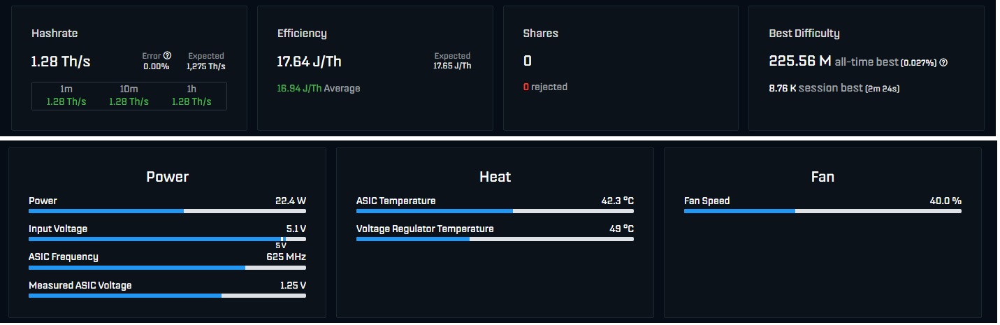 Hier ein Bild, wie die Bitaxe mit leichtem OC ohne Lüfterupgrade läuft.