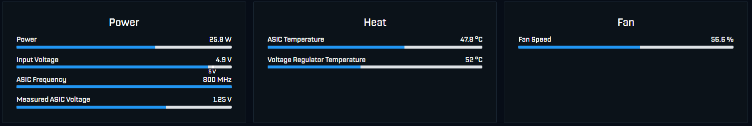 Meine aktuelle Einstellung: 800 MHz bei 1250 mV → ASIC ~51 °C, Voltage ~62 °C.