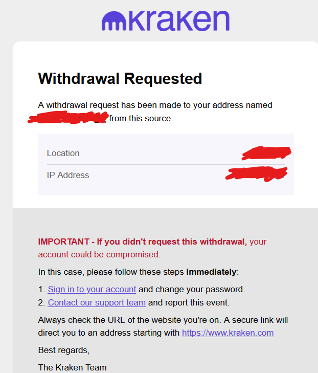 Jedes mal wenn ich bei Kraken abhebe bekomme ich sofort eine E-Mail mit folgenem Inhalt: