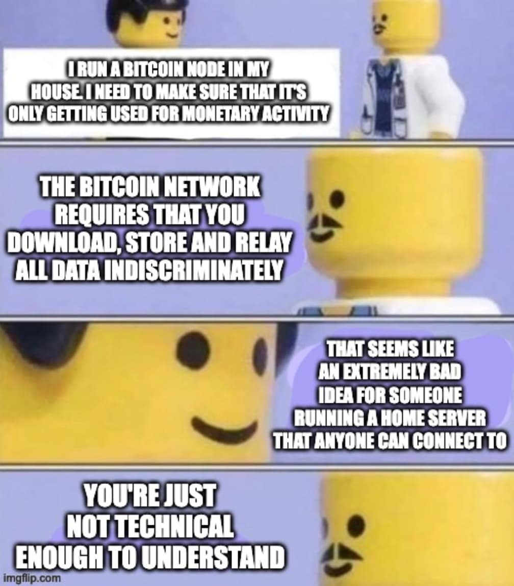 Kontext: Mit dem für Anfang Oktober angesetzten Update von Bitcoin Core auf Ver. 30 wird eine massive Erhöhung des Default-Limits des OP_RETURN Datenfeldes von 83 B auf 100.000 B stattfinden. Hier können beliebige, nicht-monetäre Daten in eine Transaktion eingebunden werden und zwar in ZUSAMMENHÄNGENDER, leicht lesbarer Form und nicht nur wie bisher über den „Inscriptions-Hack“ als zerstückelte, nicht ohne weiteres lesbare Dateifragmente. Das gleiche Update wurde 2019 schon bei BSV gemacht, woraufhin deren Blockchain mit ekelhaften, und hochgradig illegalen Daten besudelt wurde - siehe Artikel von BBC.com „Child abuse images hidden in crypto-currency blockchain“.