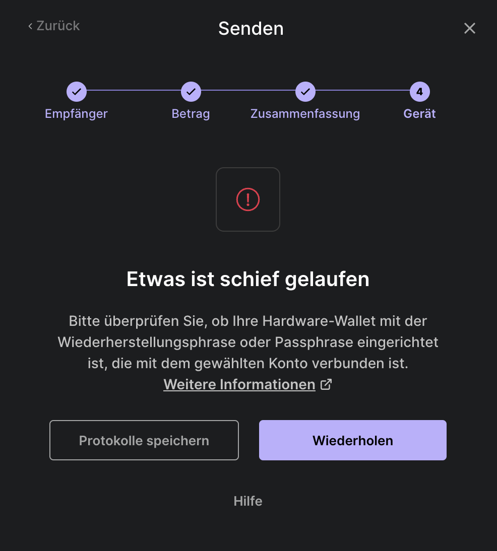 „Etwas ist schief gelaufen. Bitte überprüfen Sie, ob Ihre Hardware-Wallet mit der Wiederherstellungsphrase oder Passphrase eingerichtet ist, die mit dem gewählten Konto verbunden ist.“