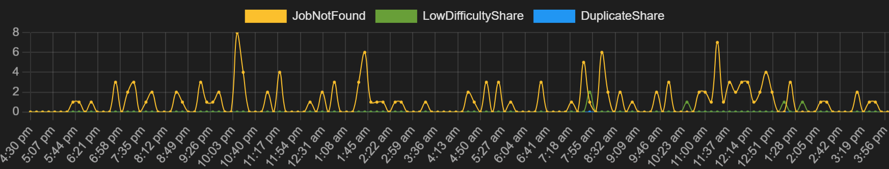 Da ich sehe das deine Hashrateschwankungen im normalen Bereich liegt, schränken die kurzen Abbrüche auch die Leistung des Geräts nicht ein. Da die NerdAxe Gamma das Problem nicht hat, deutet dass eher auf ein clientseitiges Problem hin, also ein Problem ausserhalb des Servers hier, dagegen spricht wiederum dass du das Problem bei anderen Pools nicht hast? Wie gesagt, beobachten ob sich die SessionID in anderen Pools nicht verändert/verändert, und die logs wären hilfreich.
