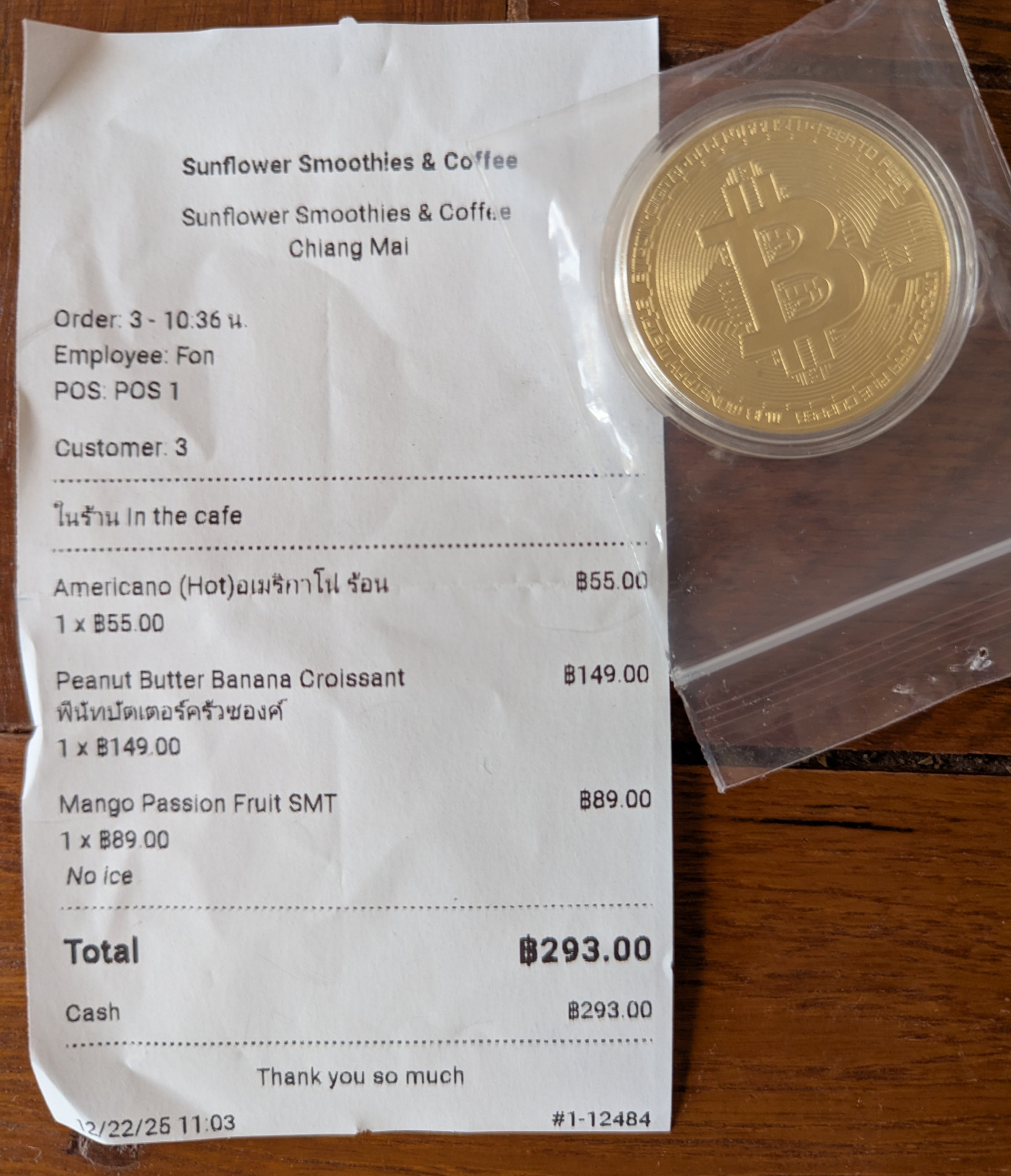 @Lichtrebell hab heute in Chiang Mai mit bitcoin bezahlt gefunden auf BTCmaps. Kannst ja auch mal hin. Sie haben sich richtig gefreut, dass mal wieder ein Bitcoiner vorbei kam. Ich hab ihr Sticker geschenkt, darauf hin hat sie mir diese Deko-Münze geschenkt. Hab sowas zwar schon, aber das ist hier ein Geben und Nehmen. Die sind hier alle so dankbar und freundlich. Die benutzten einfach die Wallet of Satoshi.