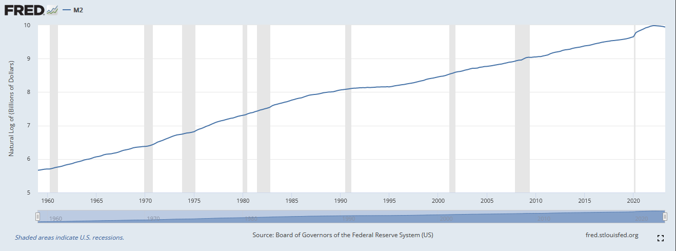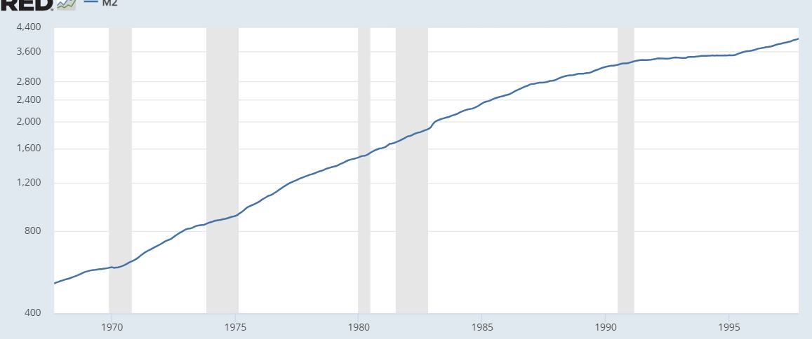 Irgendwie störe ich mich immer daran, dass die M2 Geldmenge auf einer linearen Skala angezeigt wird. Da sticht das Jahr 1971 nicht wirklich hervor. Betrachte ich es auf einer logarithmischen Skala, sieht es auch unspektakulär aus.