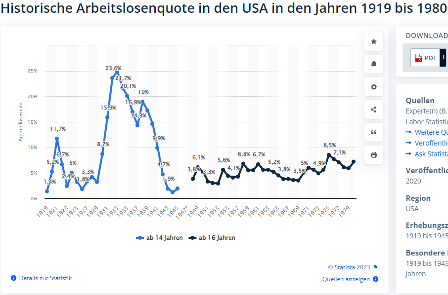 Das suggeriert der Chart ja. Es gab aber auch noch eine Welt vor 1950 und da gab es in den USA auch solch hohe Arbeitslosenquoten. Sogar höhere. Ich sehe da eigentlich keinen Zusammenhang.
